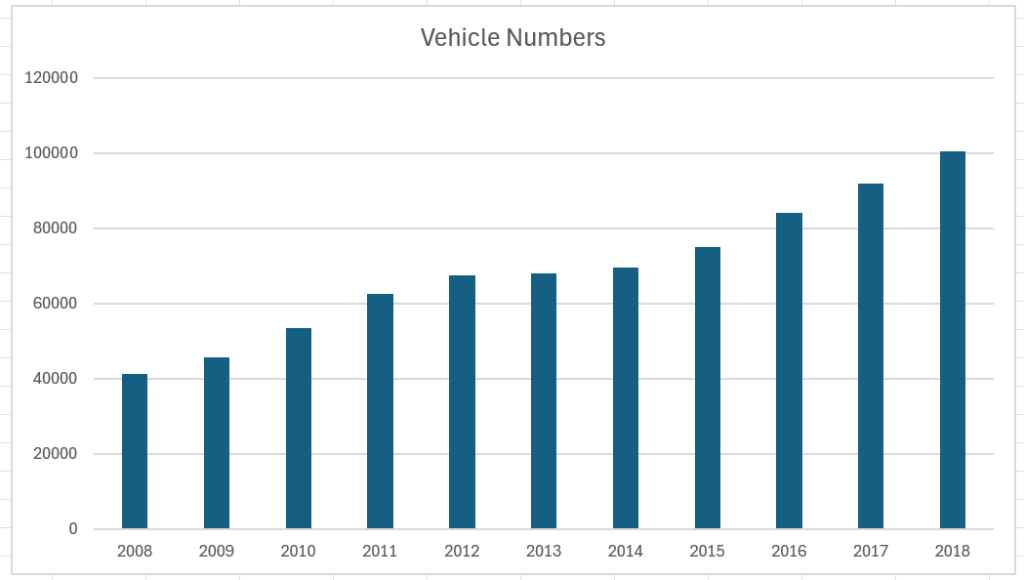 [5] There are 103,814 cars in the country as of July 2019, according to the Second Quarterly Info-Comm and Transport Statistics 2019