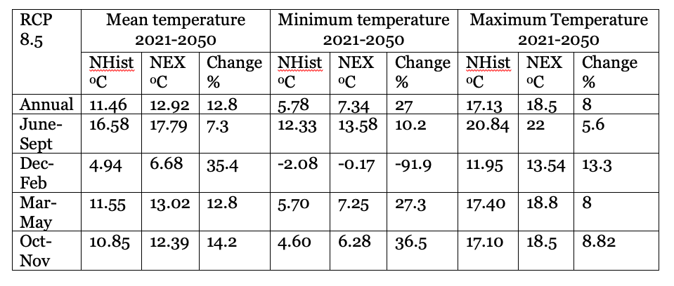 | Winter temperature | Increase by 2.10C over 2040-2069 | Increase by 2.550C in 2100 |